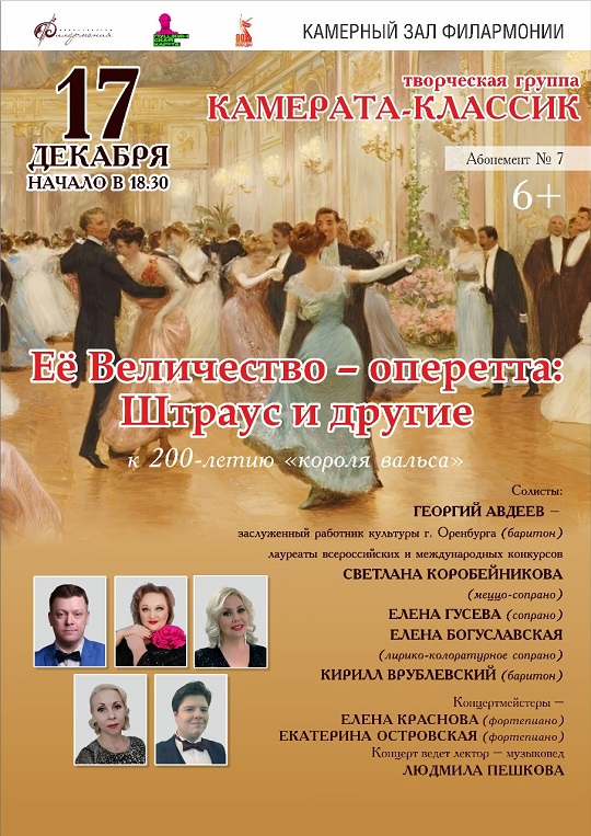 17 декабря в Камерном зале филармонии состоится концерт «Ее Величество – оперетта: Штраус и другие» творческой группы «Камерата-Классик», приуроченный к 200-летию «короля вальса»