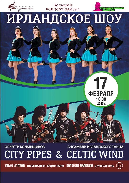 Приглашаем вас на уникальное шоу, где мощь волынок и ритм барабанов встречаются с неудержимой энергией ирландского танца. Вас ждёт незабываемый вечер в компании Оркестра волынщиков City Pipes и ансамбля ирландского танца Celtic Wind.