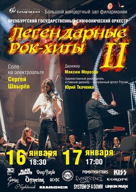 16 января в 18.30 и 17 января в 17.00 в Большом концертном зале Оренбургский государственный симфонический оркестр выступит с программой "Легендарные рок-хиты II". Дирижер - Максим Морозов, соло на электроальте - Сергей Швырев. Художественный руководитель и главный дирижер – заслуженный артист России Юрий Ткаченко. В программе концерта – бессмертные хиты таких легендарных групп, как Thirty Seconds to Mars, Black Sabbath, Deep Purple, Foo Fighters, Kiss, Survivor, The Offspring, AC/DC, Guns N’ Roses, Evanescence, Europe, Nightwish, Rammstein, System of a Down, Linkin Park.
