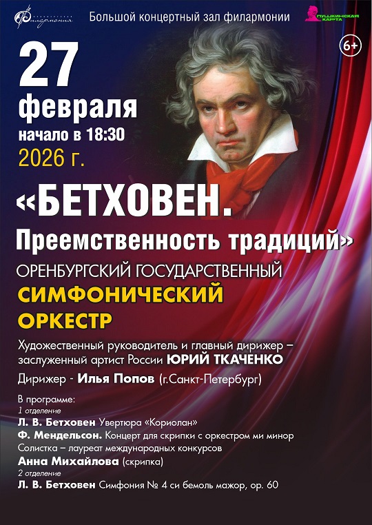 27 февраля в Большом концертном зале состоится концерт "Бетховен. Преемственность традиций" Оренбургского государственного симфонического оркестра.