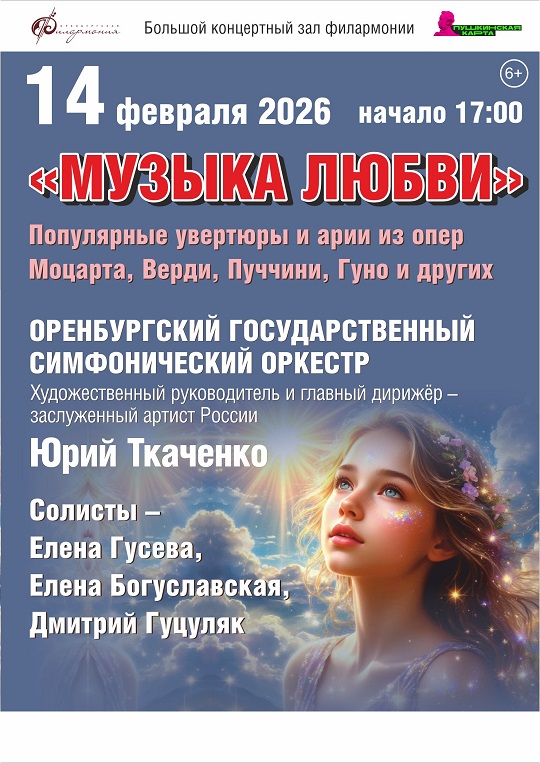 14 февраля в Большом концертном зале филармонии Оренбургский государственный симфонический оркестр представит программу "Музыка любви". Музыканты исполнят популярные увертюры и арии из опер В. А. Моцарта, Дж.Верди, Дж. Пуччини, Ш. Гуно и другие. В концерте примут участие солисты - Елена Гусева, Елена Богуславская, Дмитрий Гуцуляк. Художественный руководитель и главный дирижер - заслуженный артист России Юрий Ткаченко.